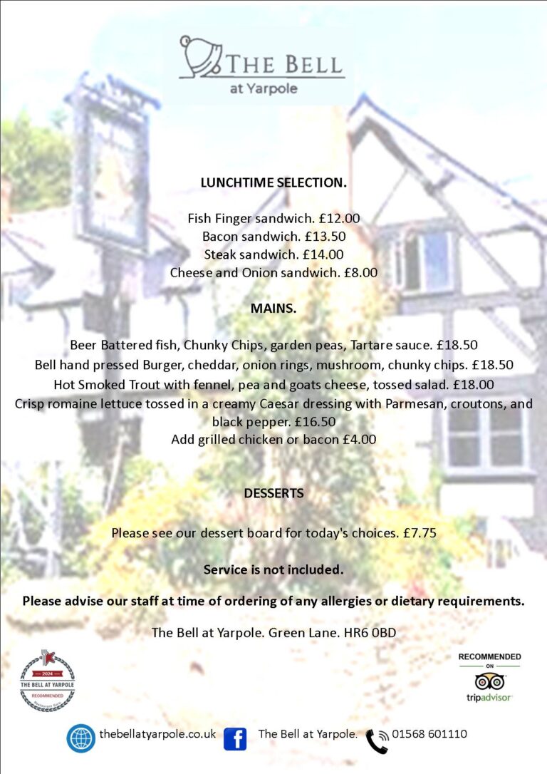 Takeaways can be booked for collection from the pub. If you have mobility issues we will be happy to deliver locally. Telephone us on 01568 601110.