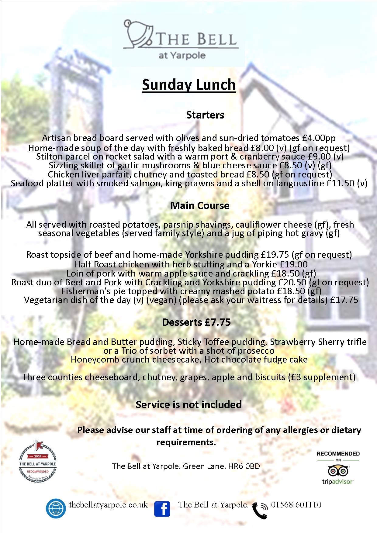 Please inform us of any allergies or special requests. There are always vegetarian options available. Children are always welcome and we provide a child’s menu. We have high chairs if needed.